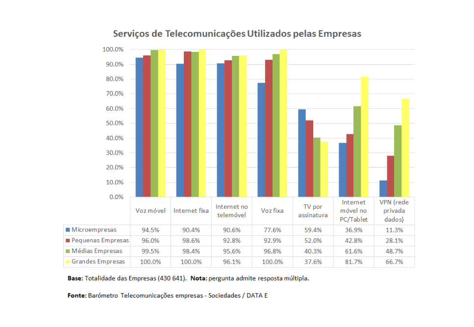 Dos resultados apurados, verificamos que a voz móvel, a internet fixa e a internet no telemóvel são os serviços mais utilizados pelas empresas, independentemente da sua dimensão. A voz fixa tem uma presença inferior nas Microempresas, ao contrário da TV por assinatura, que tem uma utilização maior nestas empresas, comparando com as empresas de maior dimensão. A internet móvel no PC/Tablet e os serviços de VPN estão mais presentes nas Grandes Empresas.