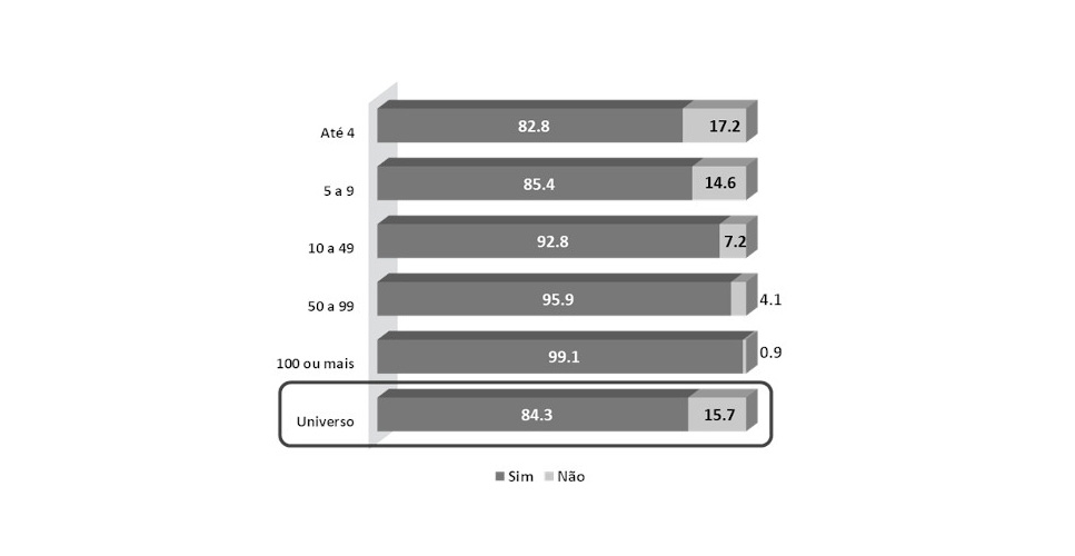 Utilização do serviço Net BankingA transformação digital está cada dia mais presente no mundo empresarial. Quase 85% das empresas em Portugal utilizam o serviço Net Banking nas operações bancárias. Se olharmos para o sub-universo de empresas com 100 ou mais pessoas ao serviço (2768 empresas), este número tende a aumentar para 99%. Considerando a totalidade das operações bancárias que as empresas realizam com o seu banco, mais de 66% das empresas que utilizam o serviço Net Banking referem que as operações realizadas através deste serviço são superiores a 75%. Utilização do serviço de Net Banking por escalão de número de pessoas ao serviço